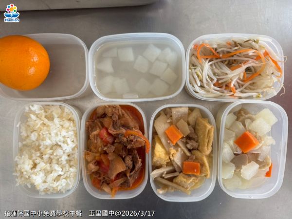 | 21 | 2026/3/30 星期一 | 白米飯 麵輪滷肉 時蔬干片 洋蔥炒蛋 時蔬 時蔬湯 果汁 | 米 豬後腿肉 麵輪 胡蘿蔔 大蒜 豬後腿肉 豆干 時蔬 大蒜 洋蔥 雞蛋 大蒜 新鮮蔬菜 時蔬 大骨 薑